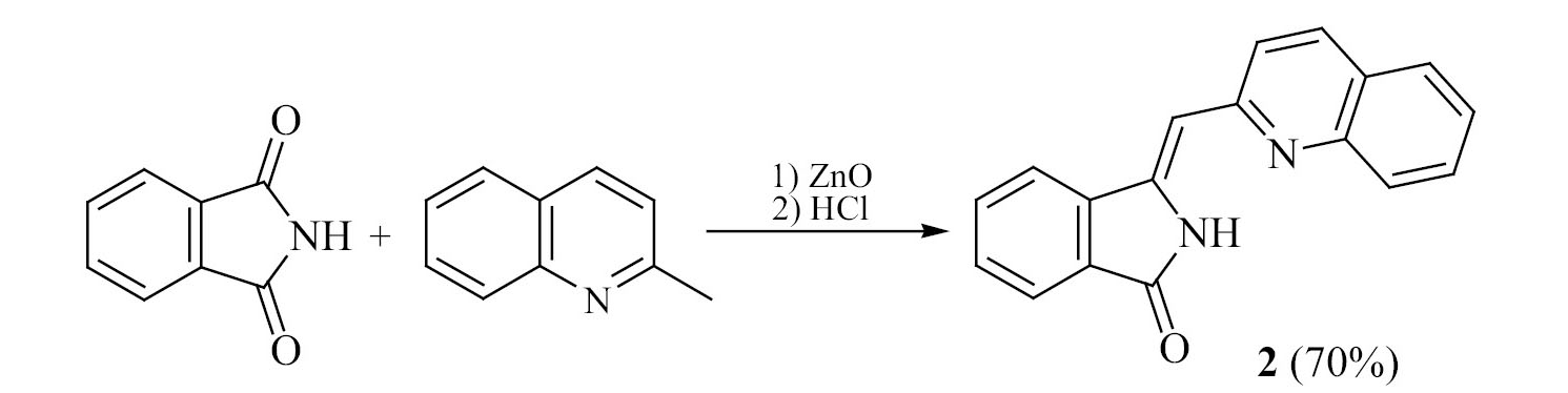 Для синтез 5-(2-хинолил)тетрабензопорфирина 1 в качестве одного из компонентов использовали продукт конденсации фталимида с хинальдином – 3-(хинолин-2-илметилен)изоиндолин-1-он 2. Он получен кипячением смеси фталимида и оксида цинка в избытке хинальдина в течение 2 ч с последующей обработкой соляной кислотой в соответствии со схемой 1.