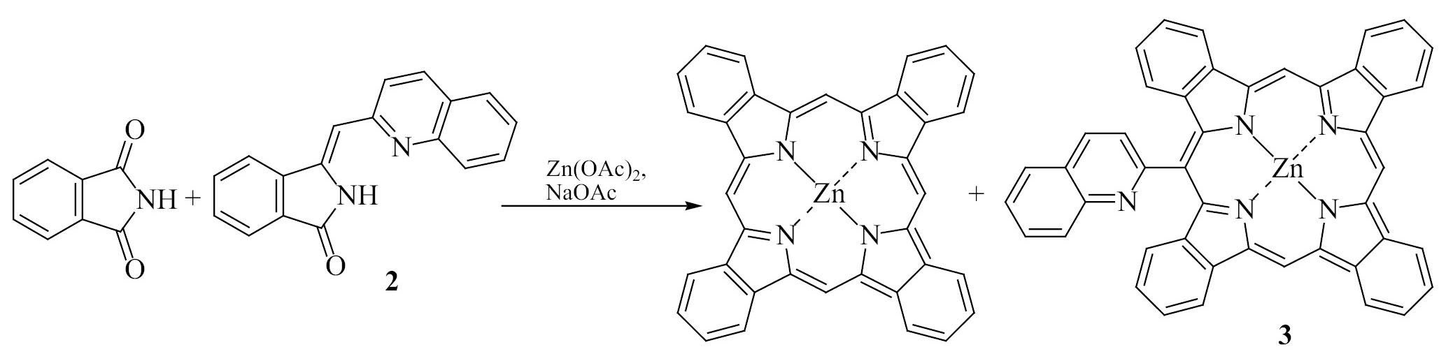 Нагревание смеси соединения 2 со значительными избытками фталимида (10 экв.), ацетата цинка (10 экв.) и ацетата натрия (10 экв.) приводит к образованию смеси двух соединений – тетрабензопорфирината цинка и 5-(2-хинолил)тетрабензопорфирината цинка 3 в соответствии со схемой 2.