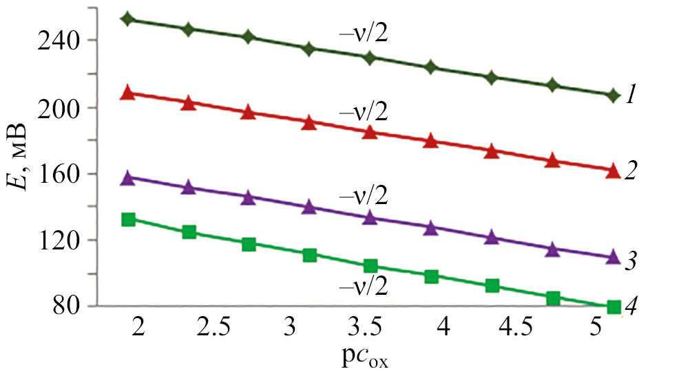Согласно теории метода оксредметрии, последовательное формирование линейных участков с тангенсами углов наклона, равными 0, –ν/2, –ν, свидетельствует о ступенчатом комплексообразовании Fe(II). Зависимости Е–рН позволяют определить общее количество координированных лигандов вокруг центрального иона комплексообразователя.