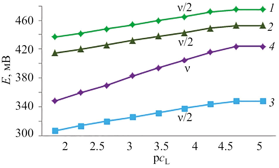 Рис. 3. Зависимость ЭДС системы Fe(0)–Fe(II)–L-Ala–Na(H)ClO4–H2O от рсL при 298.15 K и ионной силе раствора Na(H)CIO4 I = 0.10 моль/л. рН = 2.0 (1), 4.0 (2), 8.0 (3), 5.5 (4).