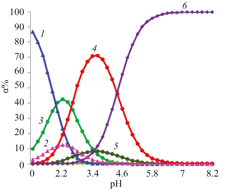 Рис. 5. Зависимость степени накопления комплексов от рН для системы Fe(0)–Fe(II)–L-Ala–Na(H)ClO4–H2O при 298.15 K, ионной силе раствора Na(H)CIO4 I = 0.10 моль/л (сFe(II) = 1·10–3 и сL = 1·10–2 моль/л). 1 – [Fe(H2O)6]2+, 2 – [Fe(OH)(H2O)5]+, 3 – [FeL(H2O)5]+, 4 – [FeL(OH)(H2O)4]0, 5 – [Fe(OH)2(H2O)4]0, 6 – [Fe(HL)L–(H2O)4]+.