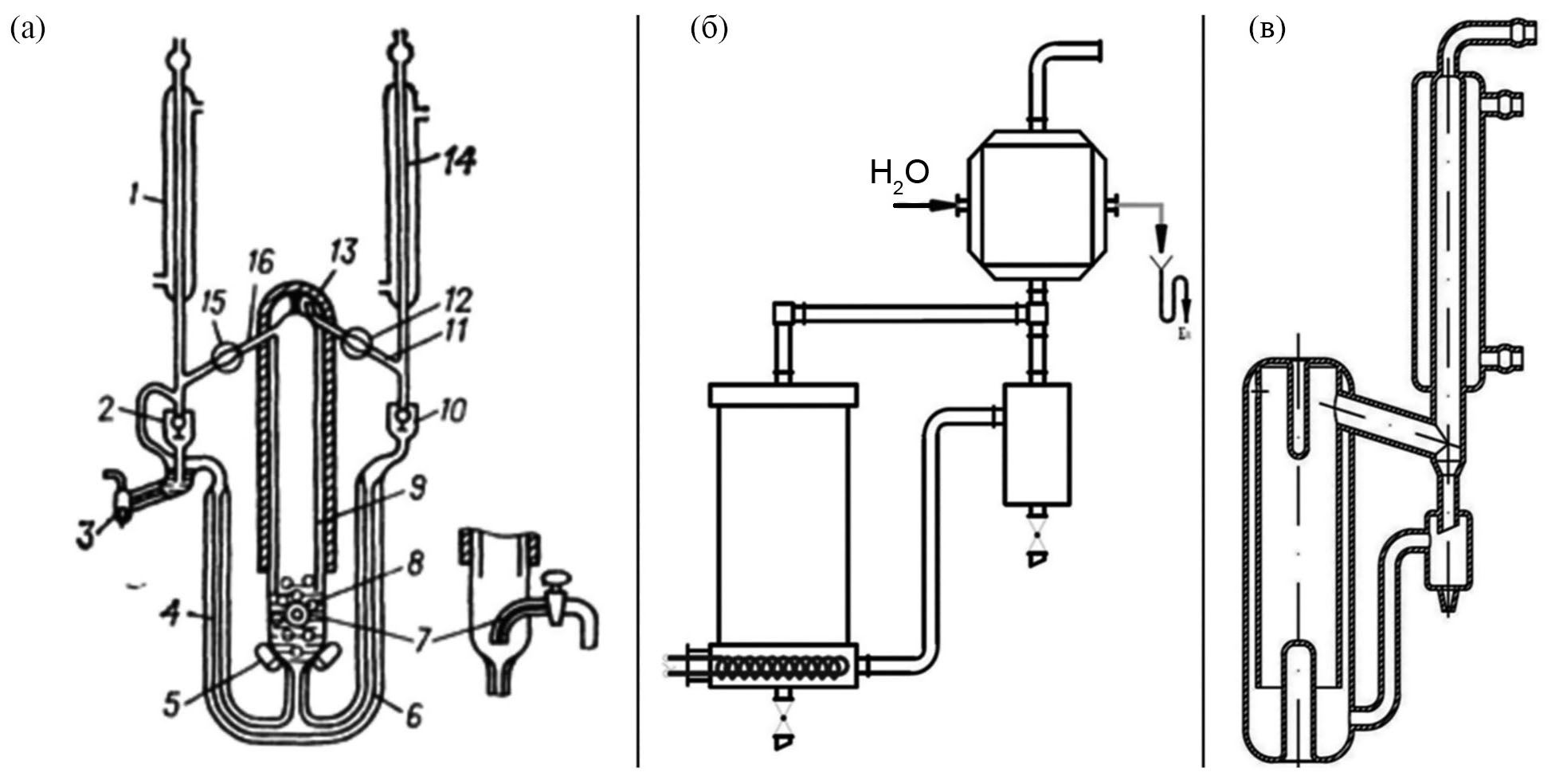 Для определения эффективности и возможности получения высокочистых неорганических кислот были проведены исследования равновесия жидкость–пар с целью определения коэффициентов разделения по регламентируемым примесям. Исследования проводили с использованием прибора типа Бушмакина [20], представляющего собой прибор циркуляционного типа. Циркуляционный метод заключается в постоянном возвращении в нагреватель (кипятильник) конденсата паровой фазы вплоть до достижения равновесия, по установлению которого пробы жидкой фазы и конденсата отбираются и анализируются. Классический вид этого прибора приведен на рис. 2а (1 – вертикальный сосуд; 2 – колокол; 3 – стерженек, 4, 8, 9, 13, 15 – трубки; 5, 10, 14 – краны; 6, 11 – обратные конденсаторы; 7 – приемник конденсата; 12 –счетчик капель; 16 – электрический нагреватель).