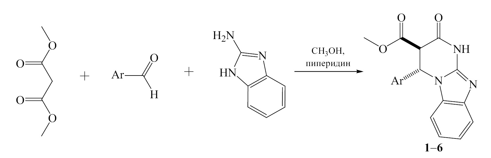 В настоящем исследовании с целью расширения круга возможных субстратов в ряду эфиров малоновой кислоты для синтеза пиримидо[1,2-а]бензимидазолов в реакцию с ароматическим альдегидом и 2-аминобензимидазолом вовлечен диметилмалонат. Установлено, что реакция протекает в метаноле в присутствии пиперидина в качестве основания в течение 2 ч. Проведенные исследования позволили установить, что единственными продуктами в данных условиях являются метил-(3R*,4S*)-4-арил-2-оксо-1,2,3,4-тетрагидробензо[4, 5]имидазо[1,2-a]пиримидин-3-карбоксилаты 1–6 (схема 1).
