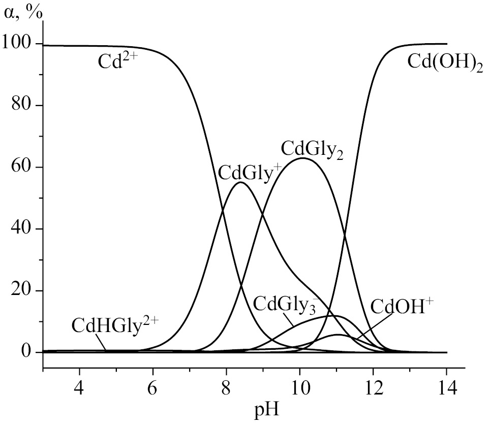 При образовании комплексных соединений глицинат-ион, как бидентантный лиганд, образует две координационные связи с ионом металла посредством азота аминогруппы и кислорода карбоксилатной группы [21–24]. Ион двухвалентного кадмия может образовывать с анионом глицина (Gly–) комплексы состава 1:1, 1:2 и 1:3 [25–30]: