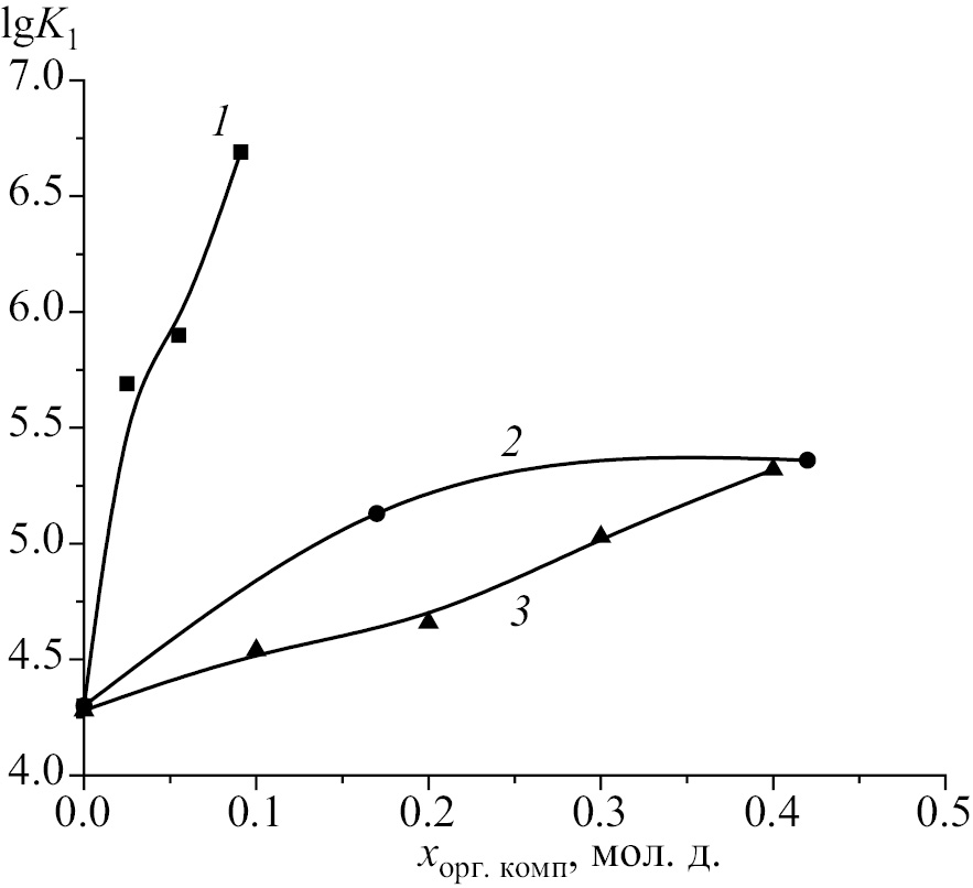 Рис. 2. Влияние состава смеси растворителей вода–диметилформамид (1) (µ = 1 М., 300 K [46]), вода–этанол (2) (µ = 0.15 М., 310 K [44, 45]), вода–диметилсульфоксид (3) (µ = 0.1 М., 298 K) на константу устойчивости моноглицината кадмия(II).