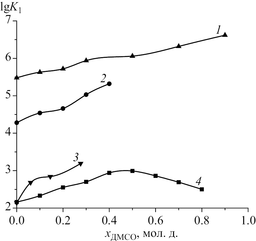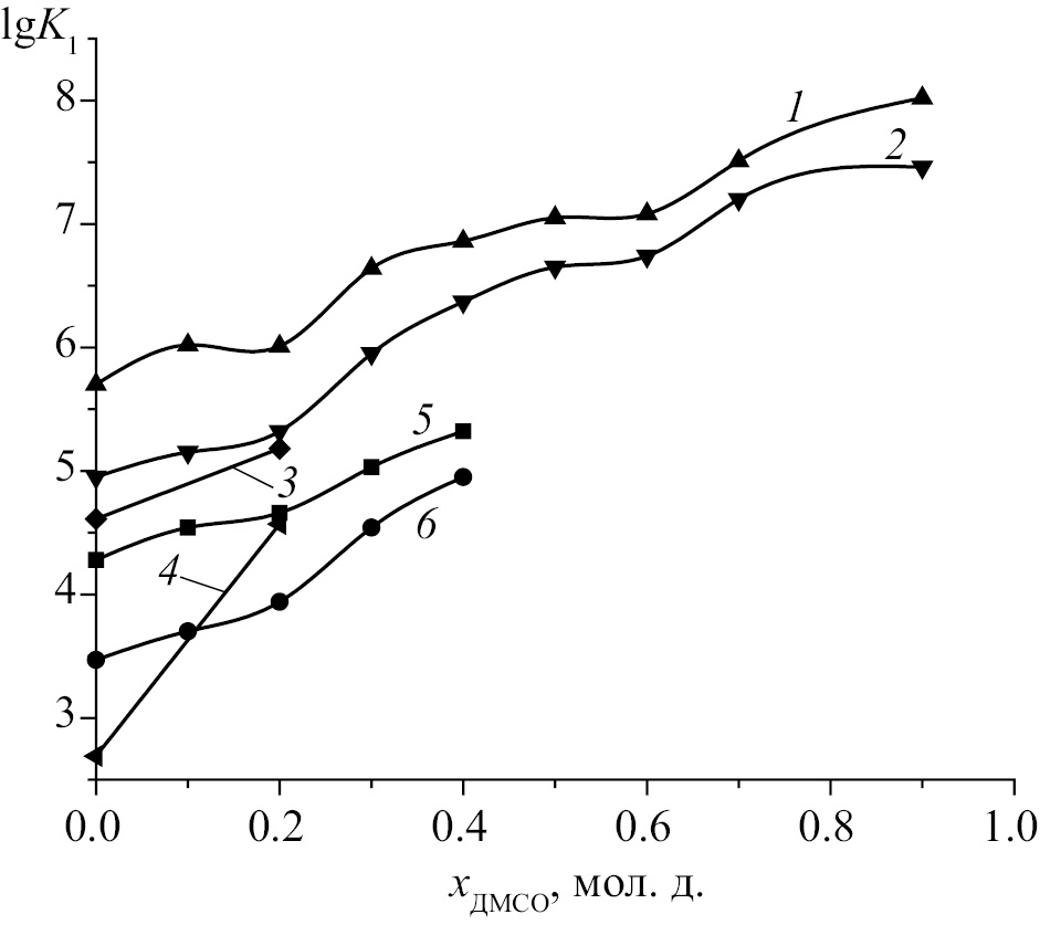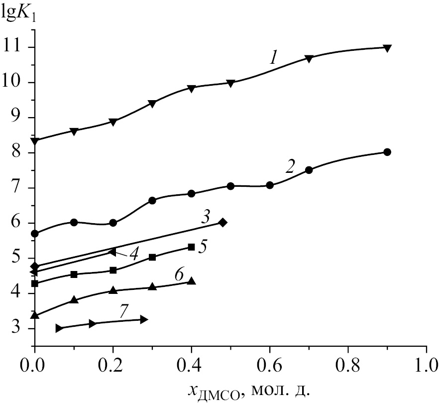 Результаты исследований процессов комплексообразования иона Cd2+ с различными лигандами показывают, что увеличение содержания диметилсульфоксида в растворе приводит к росту устойчивости комплексов кадмия(II) с этилендиамином [47], метиламином [48], тирозинат-ионом [49, 50] (рис. 3). Рост устойчивости комплексов в водно-диметилсульфоксидных смесях происходит при комплексообразовании кадмия(II) с гистидином [51], аспаргином [52], малеиновой кислотой [53], итаконовой кислотой [54].