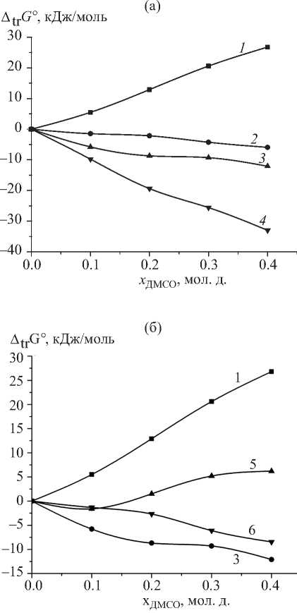 Рис. 6. Изменение энергии Гиббса реакций образования моноглицинатного (2) (a) и бисглицинатного (6) (б) комплексов кадмия(II) в смесях вода–ДМСО и энергии Гиббса переноса из воды в водно-диметилсульфоксидный растворитель глицинат-иона (1) [67], моноглицината Cd2+ (3), иона Cd2+ (4) [66], бисглицината Cd2+ (5).
