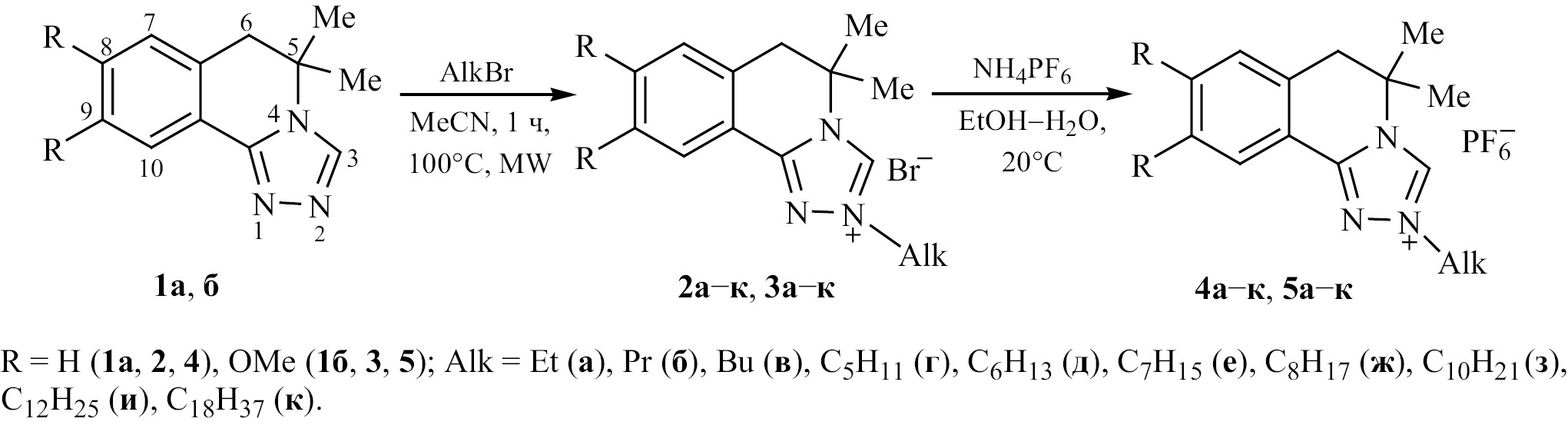 Недавно нами были получены соли 2-(замещенный бензил)-5,5-диметил-5,6-дигидро-1,2,4-триазоло[3,4-a]изохинолиния, использованные как платформа для получения комплексов палладия(II) PEPPSI-типа, проявляющих высокую цитотоксическую активность [16]. Целью настоящей работы являлся синтез ряда солей 2-алкил-1,2,4-триазоло[3,4-a]-изохинолиния как потенциальных N-гетероциклических карбеновых лигандов, пригодных для синтеза аналогичных PEPPSI-комплексов с алкильными заместителями у атома N2.