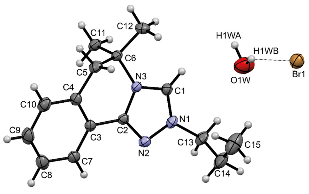 Строение солей 2б и 4a дополнительно подтверждено данными рентгеноструктурного анализа (рис. 1, 2). Данные РСА подтверждают региоселективность алкилирования исключительно по атому N2. Соединения 2б и 4a кристаллизуются в центросимметричных пространственных группах моноклинной сингонии (рис. 1, 2). Бромид 2б является моногидратом, каждая молекула воды образует две водородные связи с соседними атомами брома. Гексафторфосфат-анион в кристалле соли 4a разупорядочен по двум позициям, атомы фтора минорного компонента разупорядочения на рис. 2 не изображены. Положительный заряд в катионах обеих солей преимущественно сосредоточен на атоме азота N1. Однако в бромиде 2б сильно выражена делокализация кратных связей C1=N1 и C1–N3, их длины очень близки (табл. 2). Это может свидетельствовать о заметной делокализации заряда по атомам азота N1 и N3.