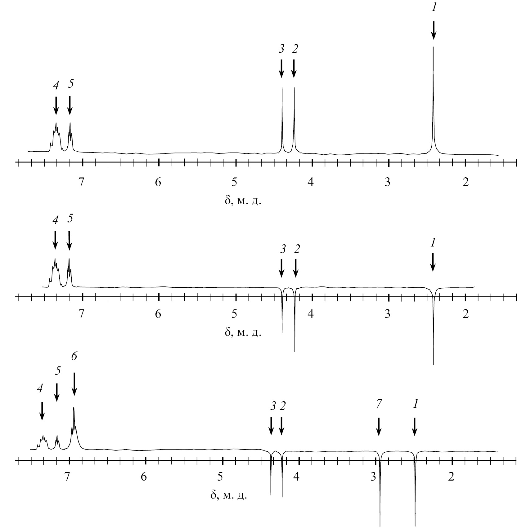 Рис. 4. Спектры ЯМР 1Н исходного тиона в гексафторбензоле: (а) темновой спектр; (б) после первой вспышки; (в) при фотолизе в течение 60 с. 1 – сигнал СН3 (2.45 м. д.); 2 – сигнал СН2 толилметиленовой группы (4.24 м. д.); 3 – сигнал СН2 бензильной группы тиона (4.35 м. д.); 4 – сигнал ароматических протонов бензильной группы (3.2 м. д.); 5 – сигнал ароматических протонов толилметиленовой группы (7.16 м. д.); 6 – ароматические протоны образовавшегося дибензила (6.9 м. д.); 7 – сигнал СН2 образовавшегося дибензила (2.9 м. д.).