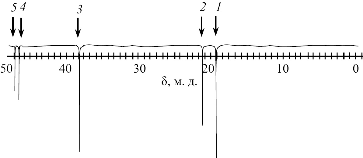 Рис. 5. Сильнопольная часть спектра ЯМР 13С тиона 1 после 60 с облучения в С6F6. Сигналы 13С растворителя накладываются на сигналы ароматических углеродов 13С. 1 – сигнал СН3 дибензила (19.0 м. д.); 2 – сигнал СН3 исходного тиона (22.6 м. д.); 3 – сигнал СН2 образовавшегося дибензила (37.9 м. д.); 4 – сигнал СН2 толилметильной группы (47.2 м. д.); 5 – сигнал СН2 бензильной группы тиона (48.5 м. д.).