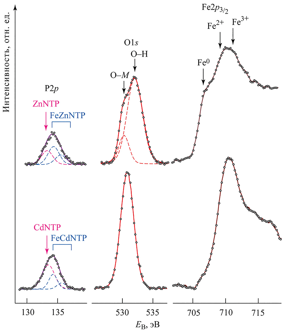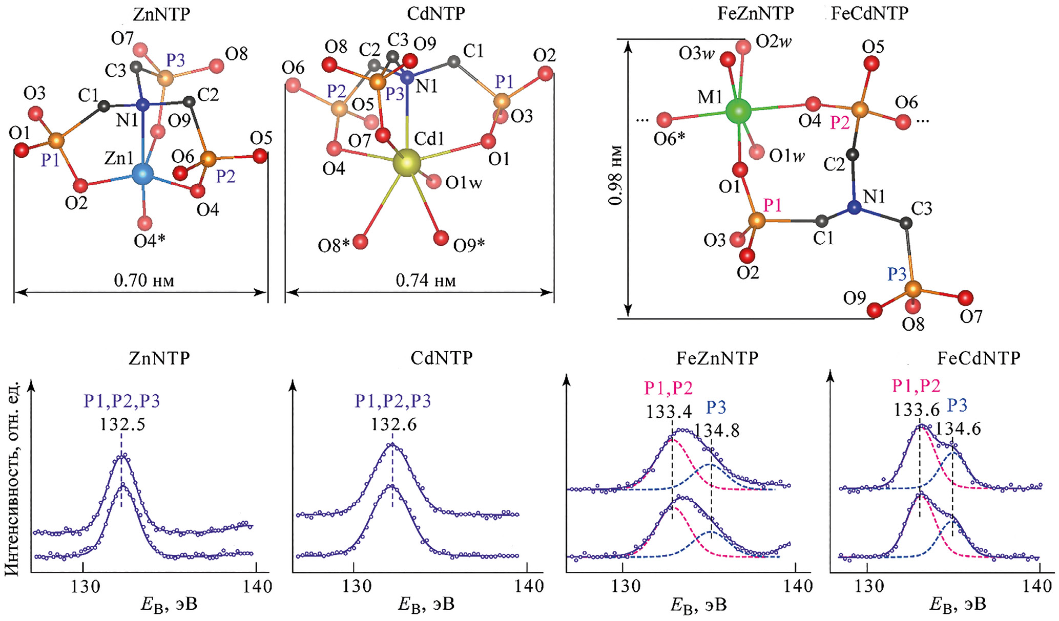 Связи, формирующие характерную структуру ближнего окружения атомов фосфора в соединениях FeZnNTP и FeCdNTP, являются сравнительно прочными. Энергия разрыва для связи P–C составляет 513±8 кДж/моль, для связи P–O – 596±6 кДж/моль, для связи Fe–O – 409±13 кДж/моль; менее прочными являются связи Zn–O – 284±14 кДж/моль и Cd–O – 142±42 кДж/моль [35]. Все же энергия разрыва этих связей значительно меньше, чем энергия ионов Ar+, используемых для травления оксидно-гидроксидных слоев на поверхности стальных образцов (в настоящей работе для травления использовали ионы Ar+ с энергией 1000 эВ). Тем не менее проверка, проведенная на индивидуальных образцах соединений ZnNTP, CdNTP, FeZnNTP и FeCdNTP, показала что при травлении ионами ионами Ar+ с энергией 1000 эВ сохраняется характерная для исходных соединений структура спектров (рис. 1г–ж), позволяющая идентифицировать эти соединения в качестве исходных веществ и продуктов реакций (1) и (2). По-видимому, это объясняется сложным характером переноса в поверхностном слое энергии, рассеиваемой ионом Ar+ при соударении с поверхностью, и уносом части энергии фрагментами разрушаемого слоя поверхности; при этом РФЭ-спектр протравленной поверхности формируется молекулярными структурами, лежащими на глубине до 5 нм [34], которые не подверглись разрушению ионами Ar+.