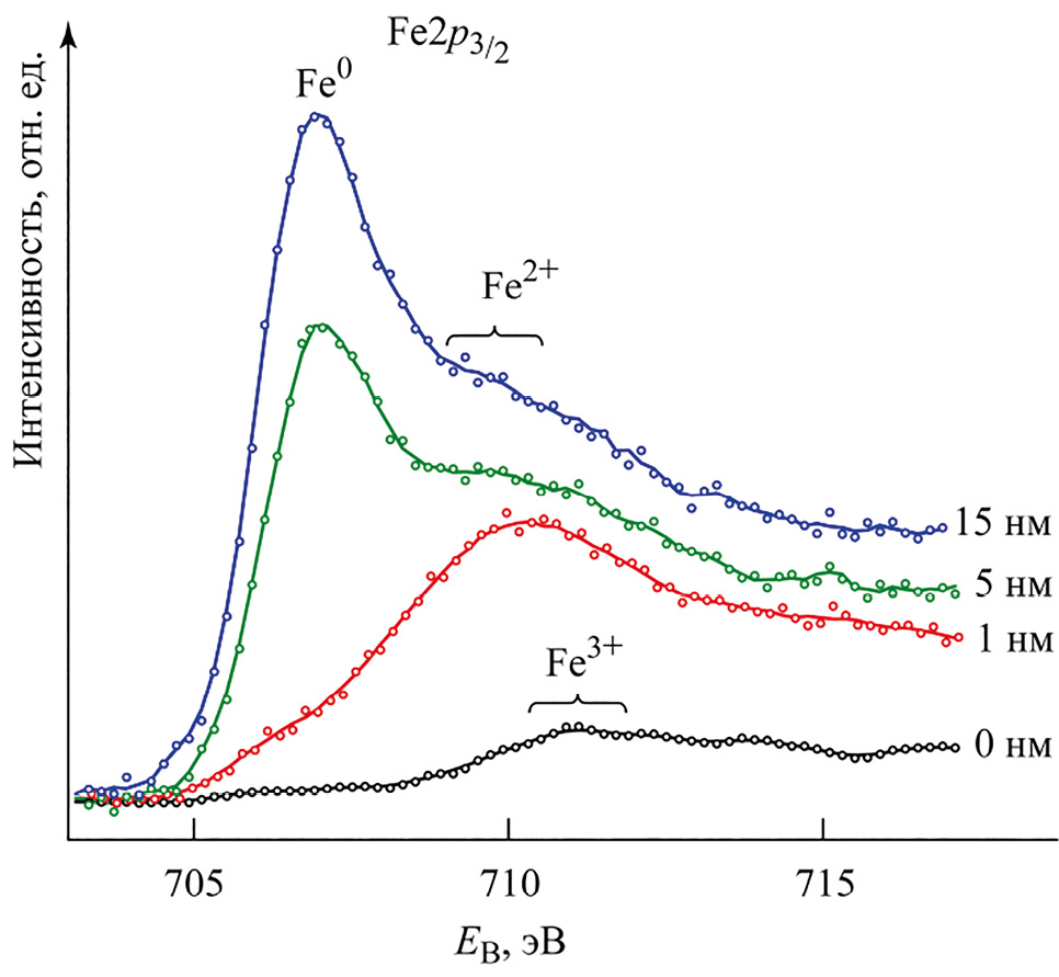На поверхности пассивной пленки на образце, поляризованном в боратно-борнокислом буферном растворе в области пассивности при потенциале Е = 0.5 В, в буферном растворе (рис. 3) преобладает железо в окисленном состоянии +3. С увеличением глубины травления в составе пассивной пленки возрастает доля ионов Fe2+ и неокисленного железа Fe0, вклад Fe3+ при этом снижается. На глубине 15 нм железо находится преимущественно в неокисленном состоянии Fe0.