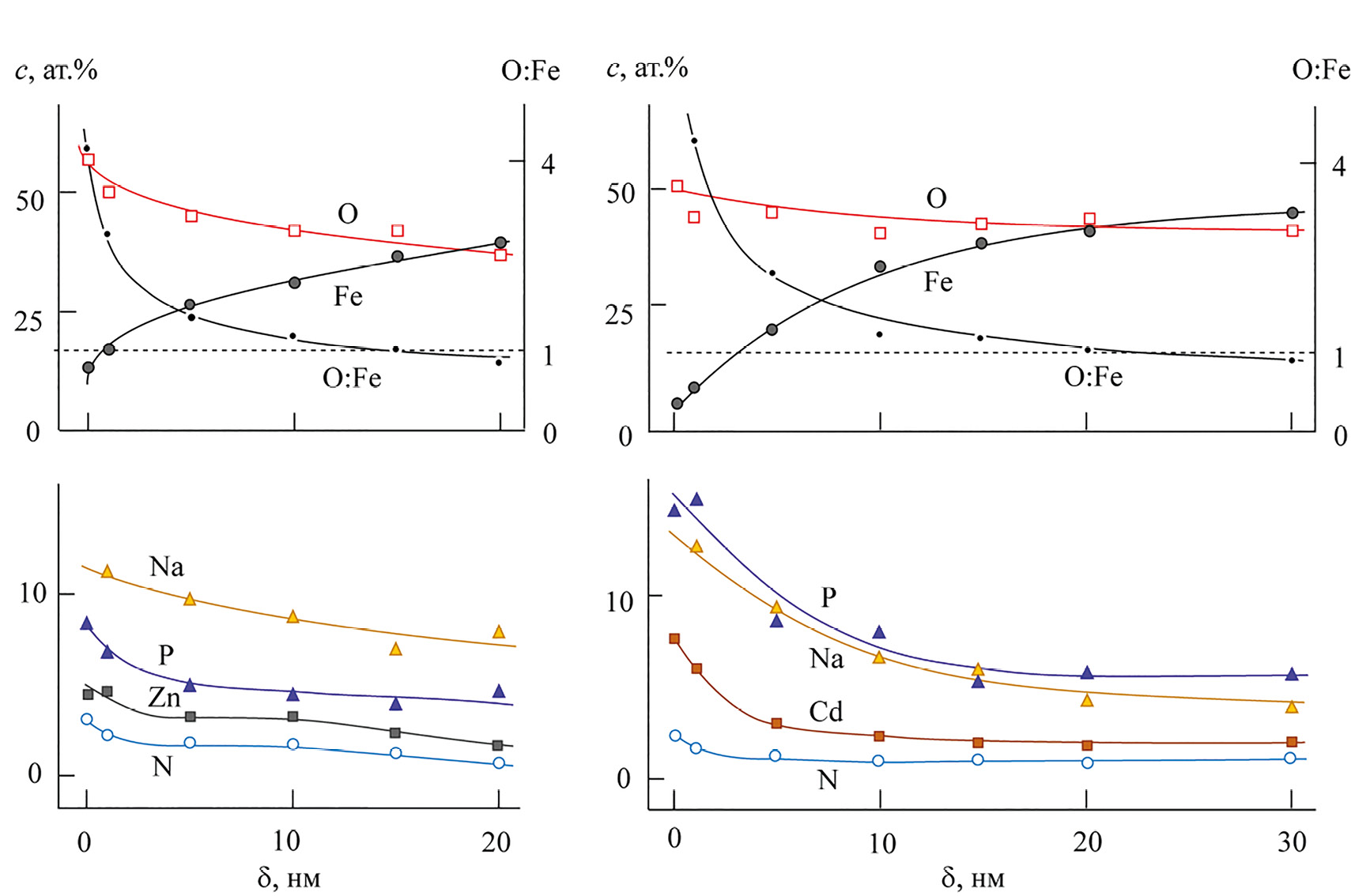 На рис. 7 графически представлены профили элементного состава поверхностных слоев образцов, подвергнутых поляризации при Е = 0.5 В в боратно-борнокислом буферном растворе, содержащем добавки ZnNTP (рис. 7а, б) и CdNTP (рис. 7в, г). В пленке, сформированной в присутствии ZnNTP, доля железа возрастает от ~13 ат% на поверхности пассивной пленки до ~40 ат% на глубине 20 нм, а концентрация кислорода, соответственно, снижается от ~60 до 40 ат% (рис. 7а). В пассивирующей пленке, образованной в присутствии CdNTP, доля железа изменяется от ~5 ат% на поверхности пассивной пленки до ~45 ат% на глубине 30 нм, доля кислорода – от ~50 до ~40 ат% (рис. 7в).
