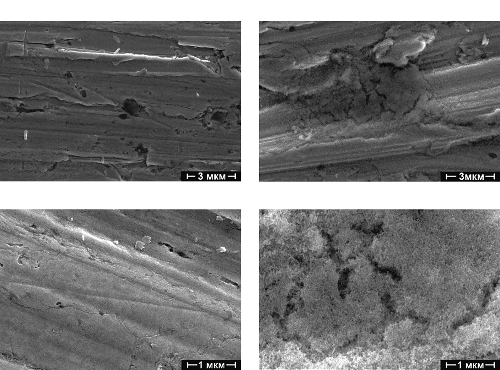 Рис. 9. Микрофотографии поверхности образцов стали Ст3кп, поляризованных в боратно-борнокислом буферном растворе (рН = 7.4) с добавкой 5 г/л ZnNTP при потенциале E = –0.1 В (а, б) и с добавкой 1 г/л CdNTP при потенциале E = 0.5 В (в, г).