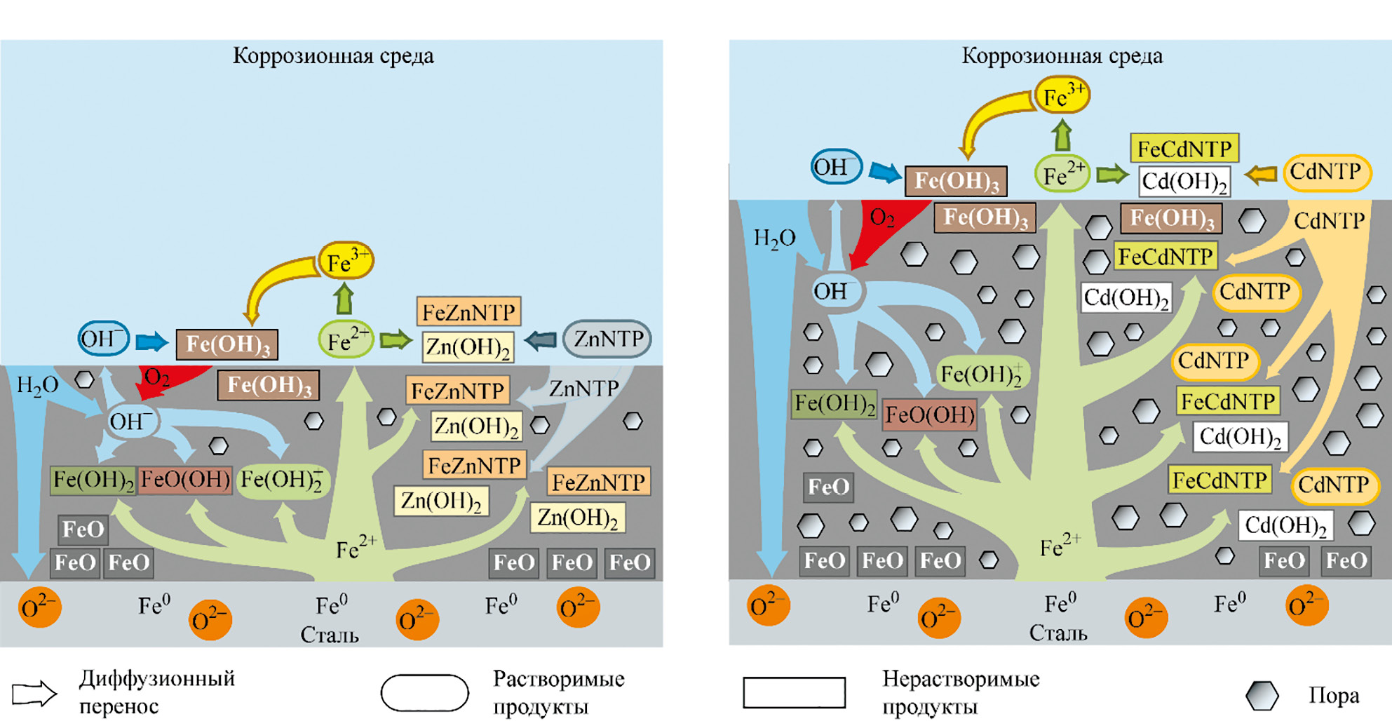 Процесс формирования пассивирующих пленок в боратно-борнокислом буферном растворе, содержащем добавки ZnNTP и CdNTP, схематически представлен на рис. 10. Основными компонентами пленок являются оксиды и гидроксиды железа, представленные различными фазами, мольное соотношение О:Fe в оксидно-гидроксидной части пленок > 1. Под оксидно-гидроксидной пленкой располагается слой субоксида FeO1–x (твердый раствор кислорода в железе) с мольным соотношением О:Fe < 1. Пленка не является статичной, она непрерывно обновляется за счет «переработки» ионами кислорода О2– все новых и новых слоев стали. Металл выступает источником ионов Fe2+, которые идут на образование пассивирующей пленки, а также поступают в коррозионную среду. В свою очередь, электролит выступает источником ионов ОН– и О2–, которые также участвуют в формировании пленки. Наряду с ионами ОН– и О2– в образовании пленки задействованы ионы ингибитора, которые на начальном этапе адсорбируются на поверхности оксидно-гидроксидной пленки, а затем диффундируют в ее внутренние слои, что оказывается возможным благодаря размерам частиц ингибиторов – 0.70 нм для ZnNTP и 0.74 нм для CdNTP (рис. 1). Оценить соотношение вкладов «несплошностей» (пор, трещин и др.) и твердой фазы в переносе в пленке затруднительно, однако стоит ожидать, что «несплошности» вносят доминирующий вклад в диффузионный процесс. В условиях встречной диффузии ионов ингибиторов и ионов Fe2+ в соответствии с уравнениями (1) и (2) в толще оксидно-гидроксидной пленки образуются фрагменты полимерных цепей FeZnNTP и FeCdNTP, диффузия которых ввиду их размера затруднена, а также Zn(OH)2 и Cd(OH)2. Локализация и доля труднорастворимых продуктов в толще пленок определяется, в первую очередь, такими факторами как концентрация и пространственная доступность вступающих в реакцию ионов ингибиторов и Fe2+. Наличие малорастворимых продуктов в составе пленок повышает их защитные свойства. Образование большого количества Cd(OH)2 в ходе реакции (2) приводит к формированию более рыхлой, пористой, диффузионно-проницаемой пленки по сравнению с таковой, формирующейся в боратно-борнокислом буферном растворе с добавкой ZnNTP.