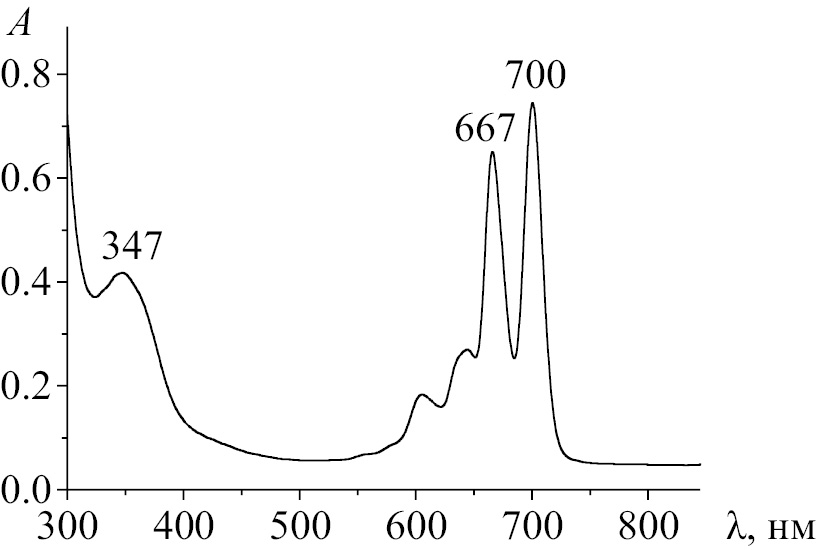 Предварительно установлено, что в малополярном бензоле и среде бензол–диметилсульфоксид с содержанием полярного компонента от 5 до 40% электронный спектр поглощения H2Pc(I)4(t-Bu)4 содержит в видимой области две интенсивные хорошо разрешенные Qх- и Qy-составляющие Q-полосы с λI = 700 и λII = 667 нм соответственно и В-полосу (полосу Соре) с λ = 347 нм (рис. 1). В присутствии н-бутиламина электронный спектр поглощения H2Pc(I)4(t-Bu)4 в среде бензол–5(10)% ДМСО подвергается существенным изменениям в отличие от бензола. С течением времени регистрируется уменьшение интенсивности Qх- и Qy-составляющих Q-полосы с λI и λII соответственно (рис. 2, 3). При этом исчезает В-полоса, характеризующая наличие пиррольных фрагментов в макроцикле (рис. 3), а цвет раствора изменяется от изумрудного до бесцветного.