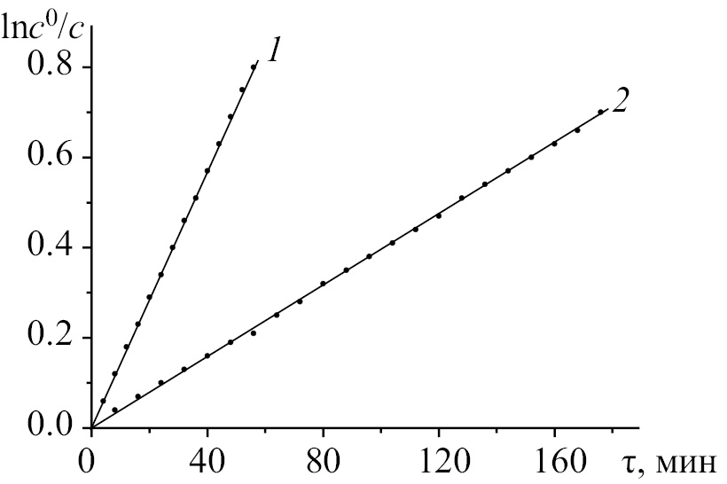 Рис. 4. Зависимость ln(c0/c) от времени деструкции H2Pc(I)4(t-Bu)4 (1) и H2Pc(I)4(t-Bu)4∙2BuNH2 (2) в присутствии BuNH2 в среде бензол–5% ДМСО при 333 K и [BuNH2] = 4.58 моль/л.