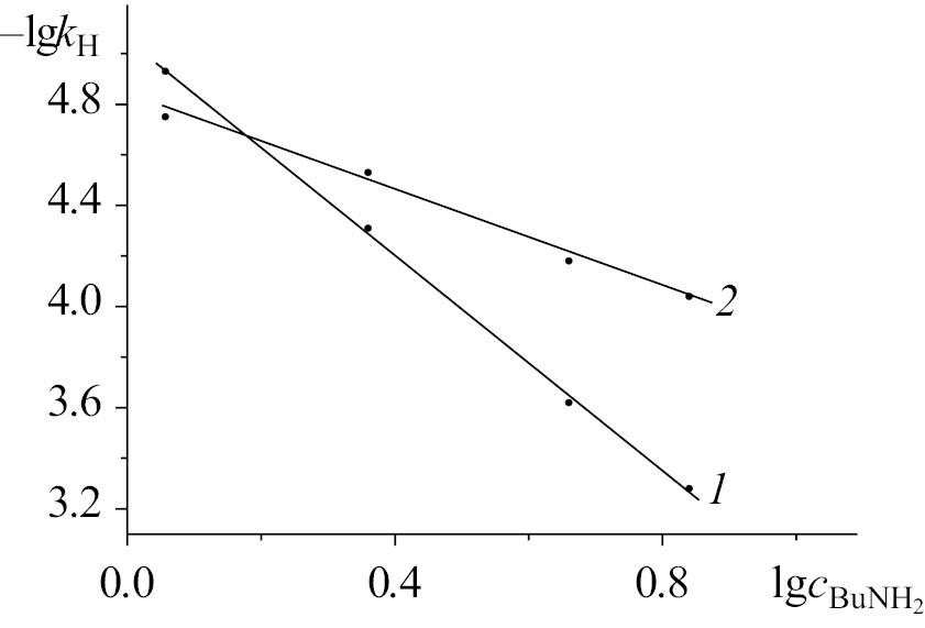 Рис. 5. Зависимость lgkH от lgc0BuNH2 реакции деструкции H2Pc(I)4(t-Bu)4 (1) и H2Pc(I)4(t-Bu)4∙2BuNH2 (2) в присуствии BuNH2 в среде бензол–5% ДМСО (1) и бензол–20% ДМСО (2) при 333 K.