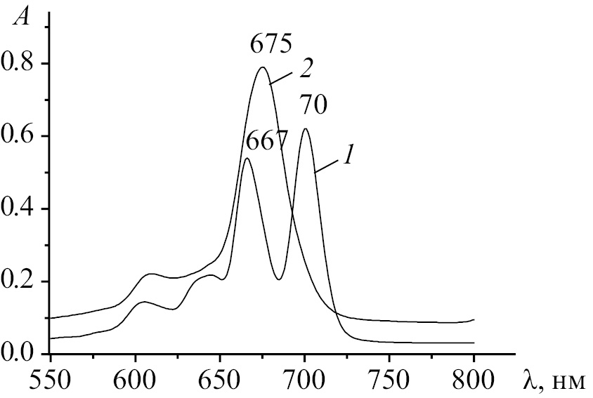 Рис. 6. Электронный спектр поглощения H2Pc(I)4(t-Bu)4 в бензоле (1) и среде бензол–ДМСО (2) при c0BuNH2 = 4.58 моль/л при 298 K.