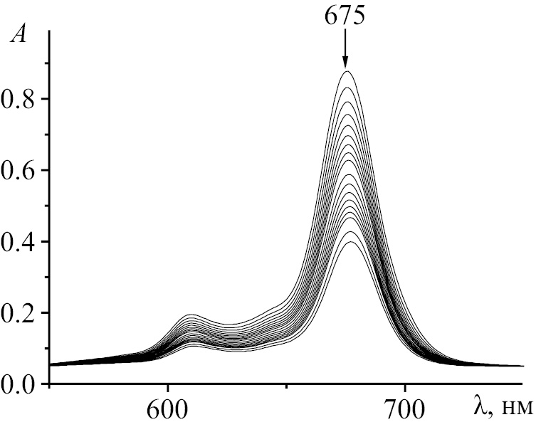 Дальнейшие исследования показали, что комплекс с переносом протонов H2Pc(I)4(t-Bu)4 ∙ 2BuNH2 в среде бензола с содержанием ДМСО от 20 до 40% является кинетически неустойчивым. В электронном спектре поглощения с течением времени регистрируется уменьшение интенсивности нерасщепленной Q-полосы с λ = 675 нм (рис. 7, 8), которое сопровождается обесцвечиванием раствора.
