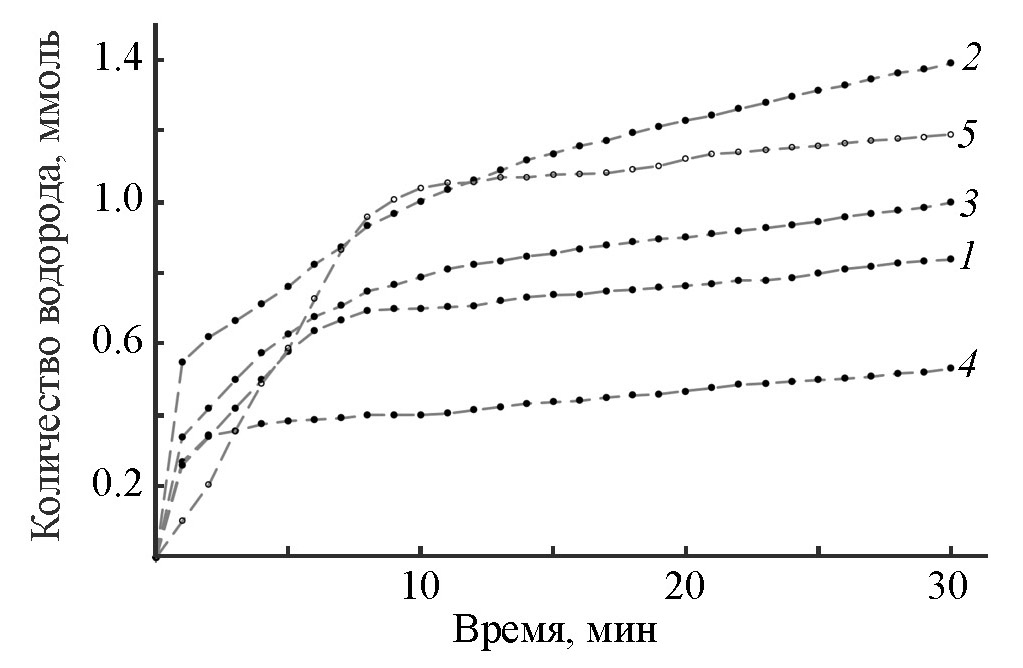 Рис. 2. Кривые поглощения водорода (2 МПа, 90°С, 30 мин, этанол:вода = 1:1) при использовании палладиевых катализаторов, нанесенных на углерод-минеральный носитель, полученный: 1 — карбонизацией сапропеля минерального типа; 2 — карбонизацией сапропеля минерального типа, активированный водяным паром; 3 — карбонизацией сапропеля органического типа; 4 — карбонизацией сапропеля органического типа, активированный водяным паром; 5 — карбонизацией сапропеля минерального типа (реакция гидродехлорирования проводилась: 1–4 — в присутствии NaOH, 5 — в отсутствие NaOH).
