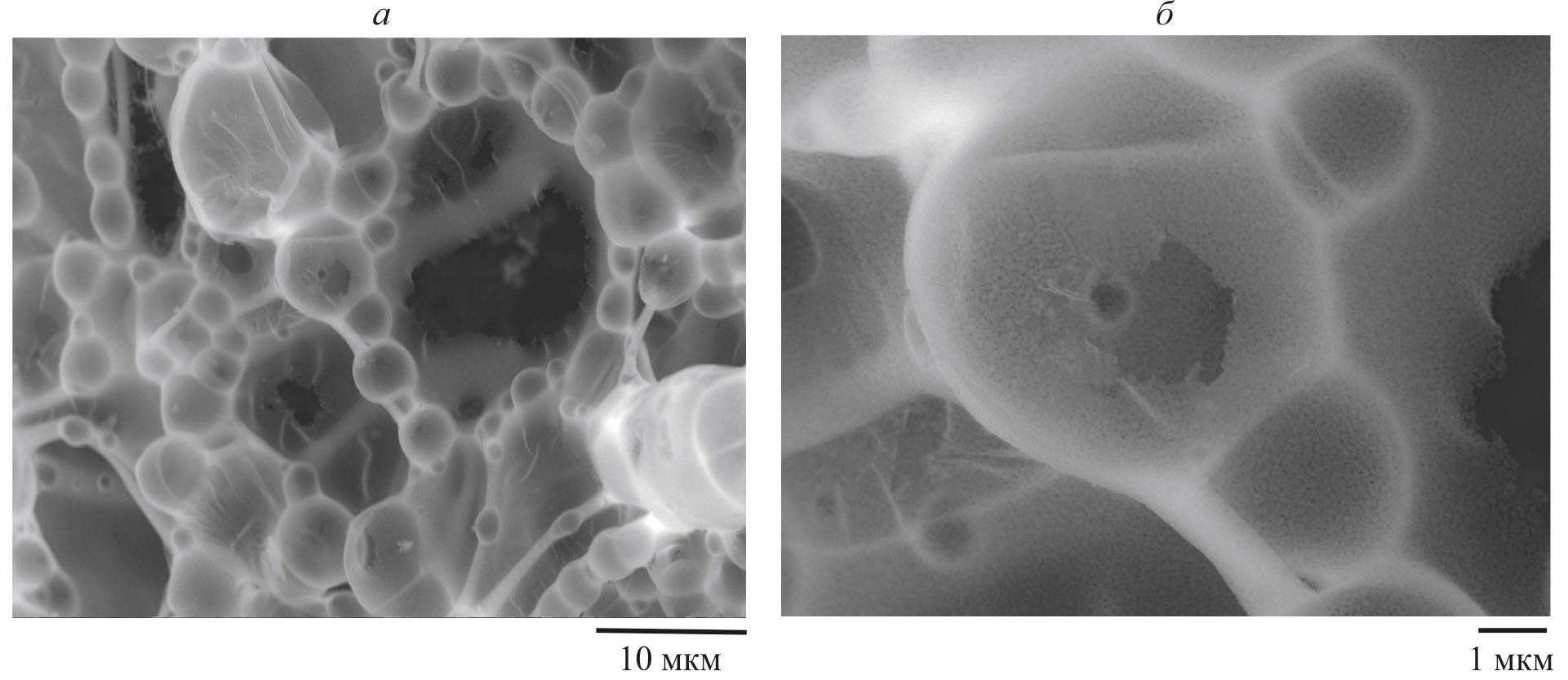 Титанат магния MgTiO3 имеет ячеистую микроструктуру с развитой системой пор (рис. 2), которая сформирована в результате выделения большого объема газообразных продуктов в процессе самораспространяющегося высокотемпературного синтеза. Значения насыпной плотности заметно увеличиваются с увеличением содержания TiО2 в составе гетерооксидных систем, при этом минимальное значение характерно для образца TiO2·4MgO и составляет 0.07 г·см–3 (табл. 1).