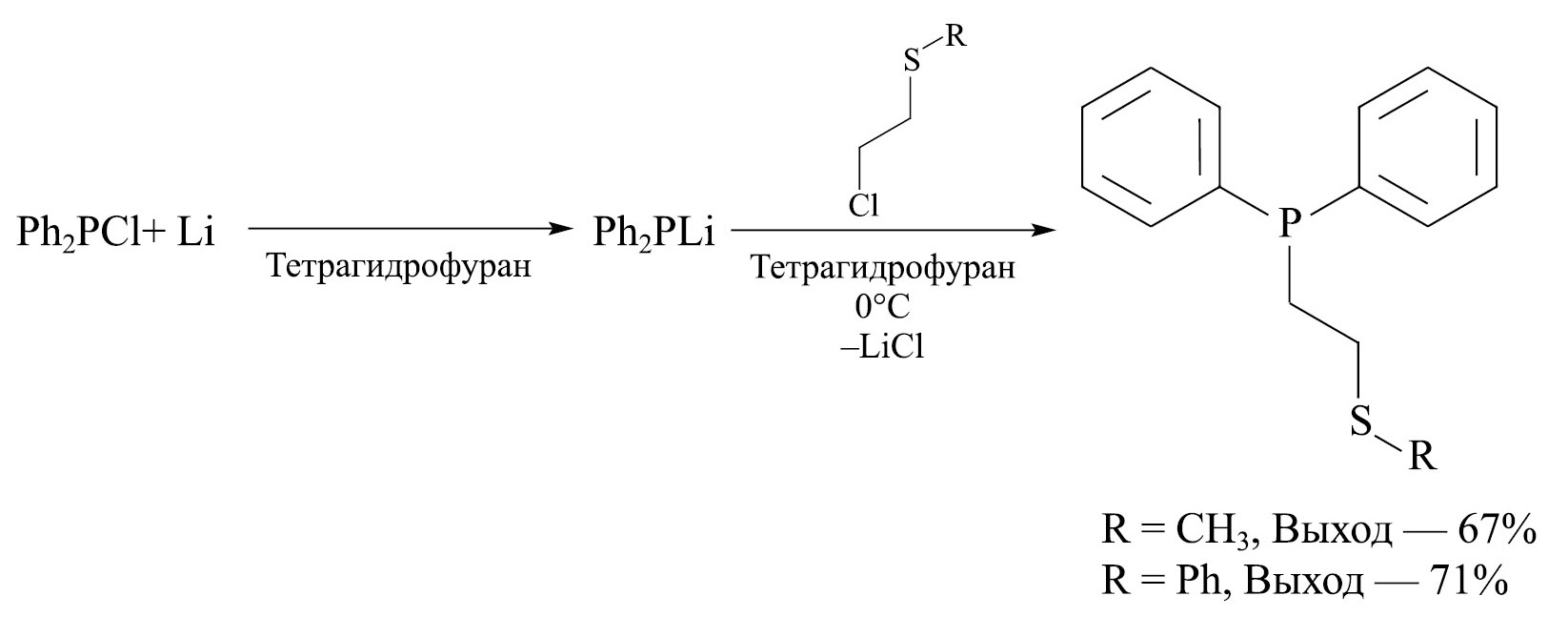 Синтез (2-метилтиоэтил)дифенилфосфина проводили путем взаимодействия хлордифенилфосфина с трехкратным избытком металлического лития в среде тетрагидрофурана с последующим добавлением 2-хлорэтилметилсульфида при температуре 0°C согласно методике [9] . Выход 67%.