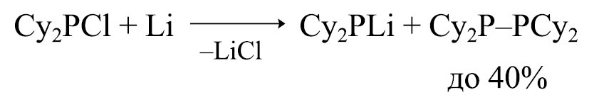 Согласно данным 31P ЯМР-спектроскопии, в результате взаимодействия хлордициклогексилфосфина с литием по схеме (IV) образуются дифосфиновые производные, выделение которых из реакционной смеси является трудоемким процессом, приводящим к значительному снижению выхода целевого продукта. Поэтому для получения дициклогексилфосфида лития и дальнейшего синтеза фосфин-тиоэфирных лигандов на его основе использовали реакцию дициклогексилфосфина с н-бутиллитием по схеме (V), в результате которой не образуются дифосфины. В результате с приемлемыми выходами были получены четыре фосфин-тиоэфирных лиганда, различающиеся природой заместителей при атомах фосфора и серы.