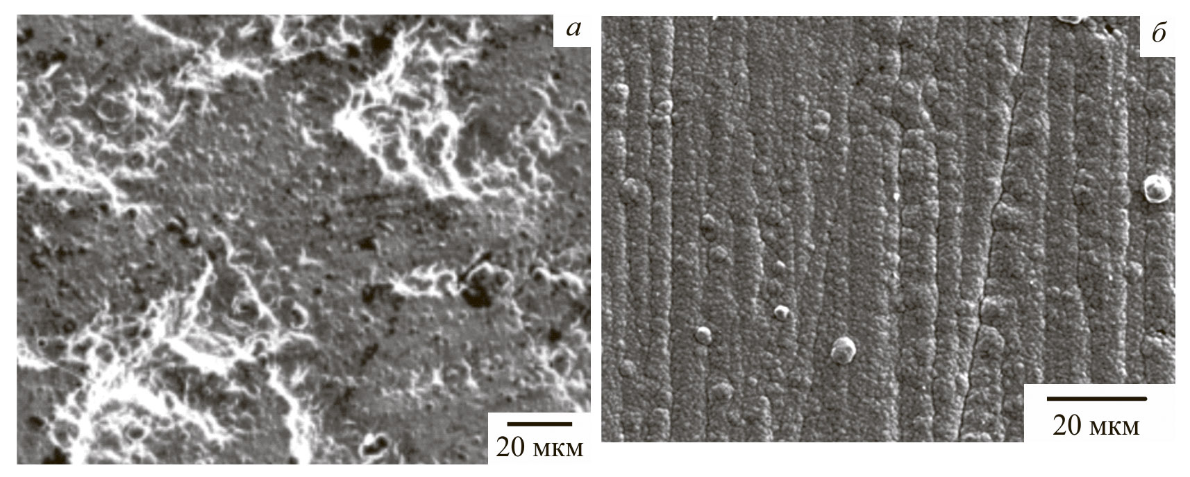 Рис. 1. Изображение поверхности пленок W–Ni (а) и W–Co (б), полученных на образцах GeTe.
