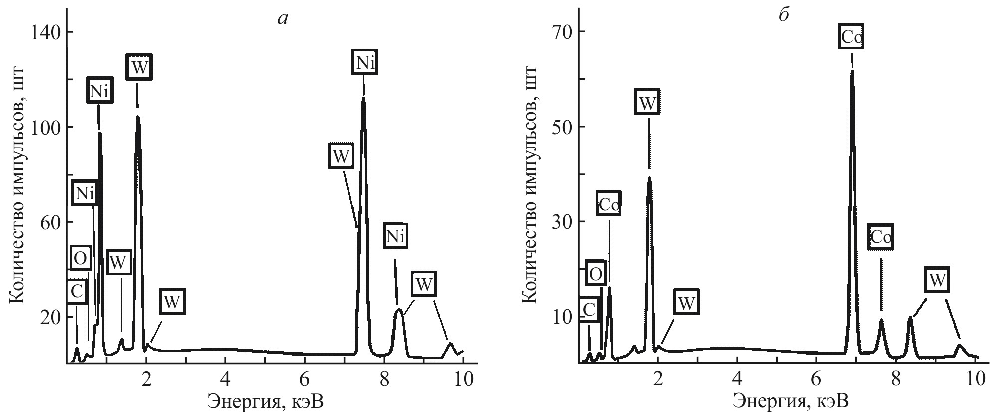 Рис. 2. Энергодисперсионная диаграмма состава пленок сплавов W–Ni (а) и W–Co (б), полученных на образцах GeTe.