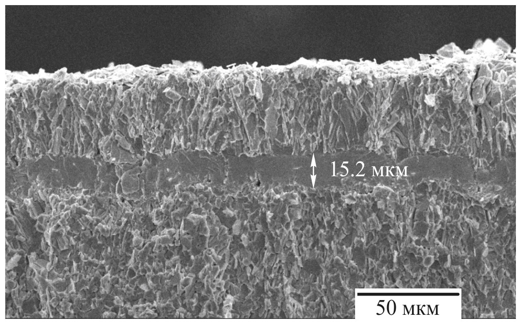 Толщина пленки W–Co составила 15.2 мкм (рис. 3) после электрохимического осаждения в течение 30 мин. На пленке W–Co сформирован слой Sn толщиной порядка 35 мкм.
