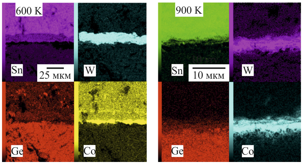 Рис. 4. Поэлементное картирование скола образцов Bi0.4Sb1.6Te3 и GeTe со сформированной контактной системой W–Co/Sn после отжига при 600 и 900 K.