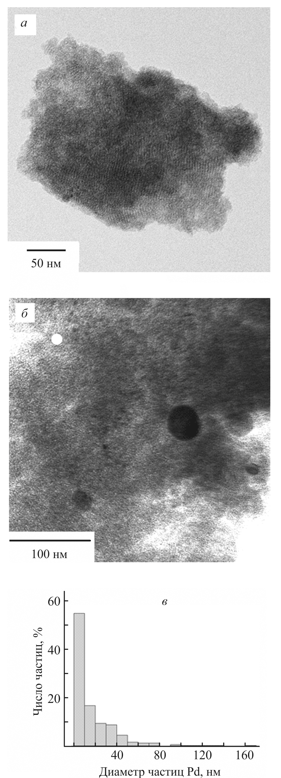 Рис. 4. Микрофотографии (а, б) Pd катализатора, нанесенного на мезопористый цирконосиликат, и диаграмма распределения наночастиц Pd по размерам (в).