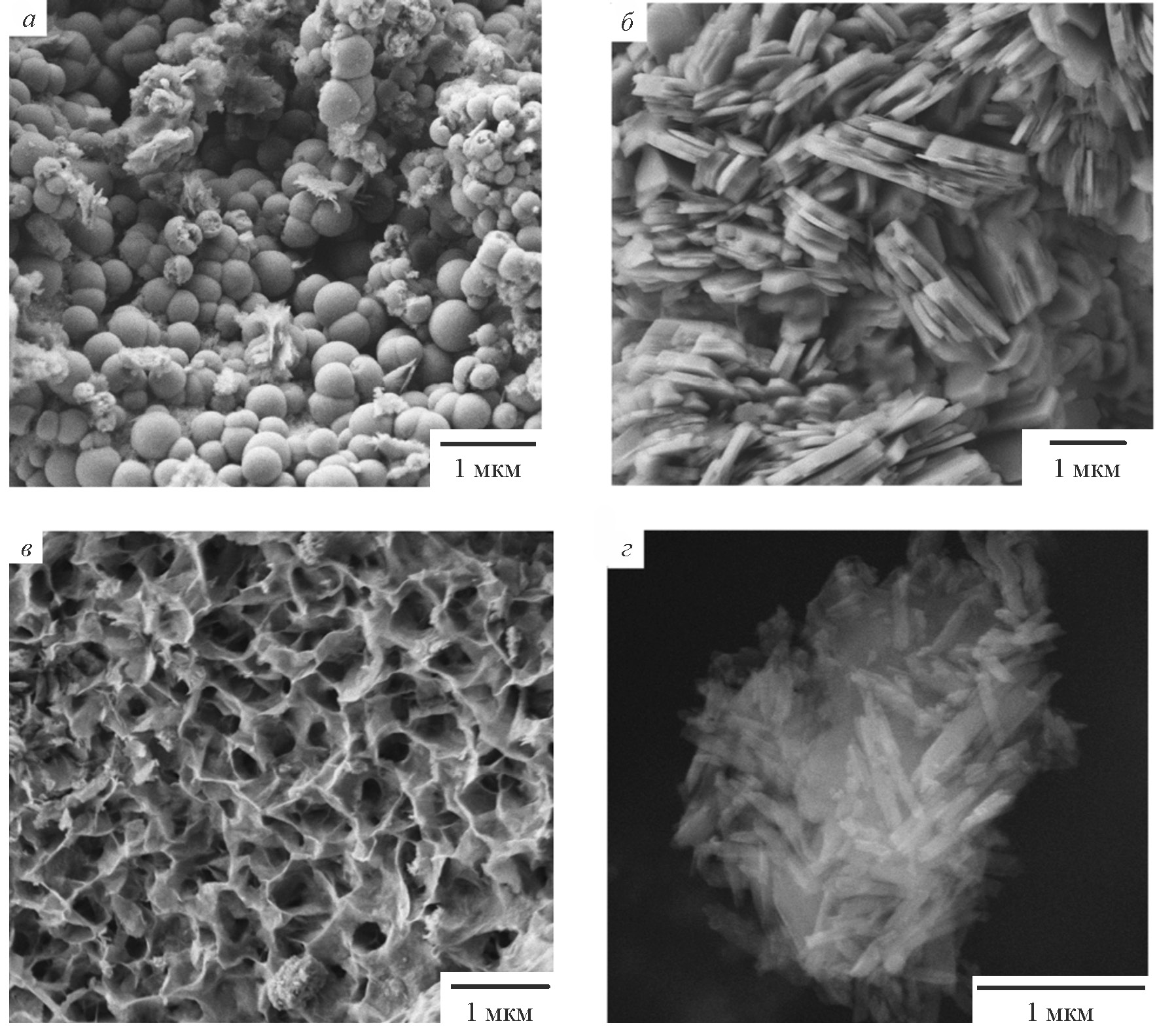 Рис. 3. Микрофотографии частиц каолинита с различной морфологией: а — сферы (материал авторов), б — пластинки (материал авторов), в — губки [116], 1 г — трубки [117]. 2