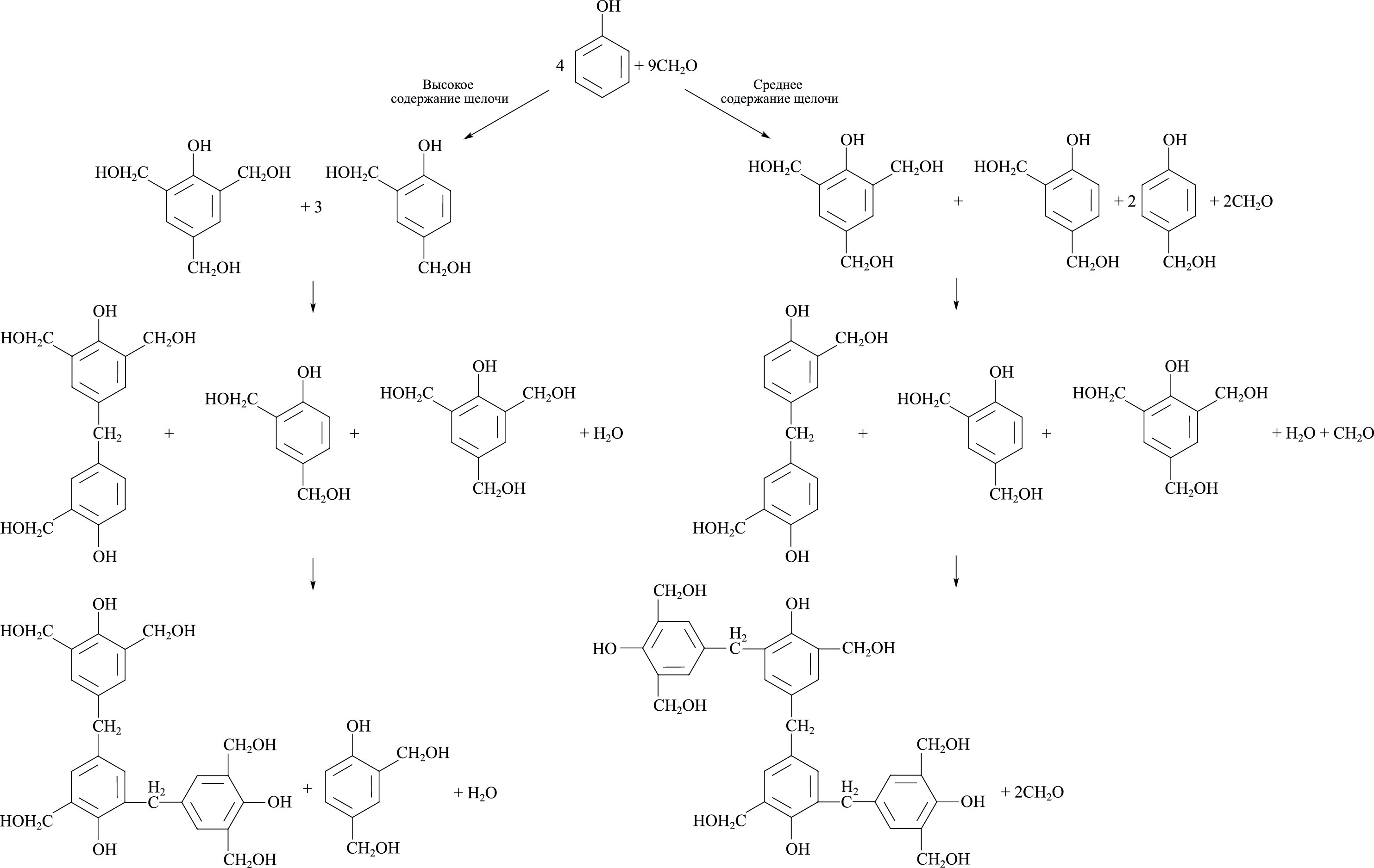 4. Схема предполагаемых путей образования фенолоформальдегидных олигомеров при высоком и среднем содержании NaOH в реакционной смеси