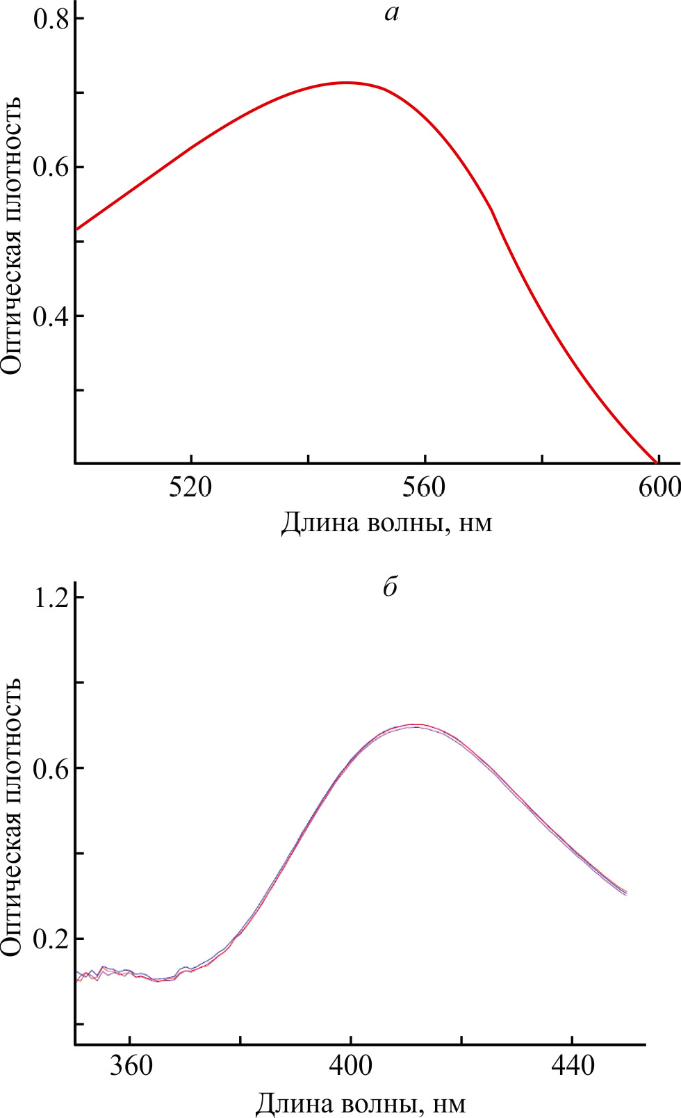 Рис. 1. Cпектры испытуемого раствора лекарственного препарата «Боярышника плоды» при определении содержания: а — процианидинов в пересчете на цианидина хлорид, б — суммы флавоноидов в пересчете на гиперозид.