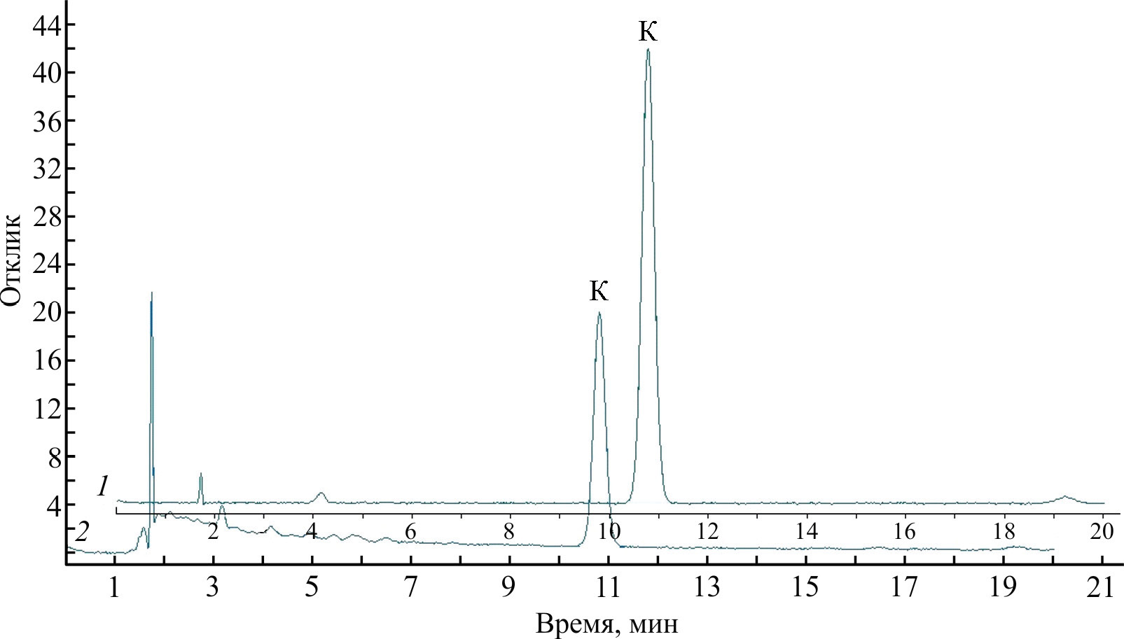 Рис. 2. Хроматограммы стандартного образца кверцетина (1) и испытуемого раствора лекарственного препарата «Боярышника плоды» (2); К — пик, соответствующий кверцетину.