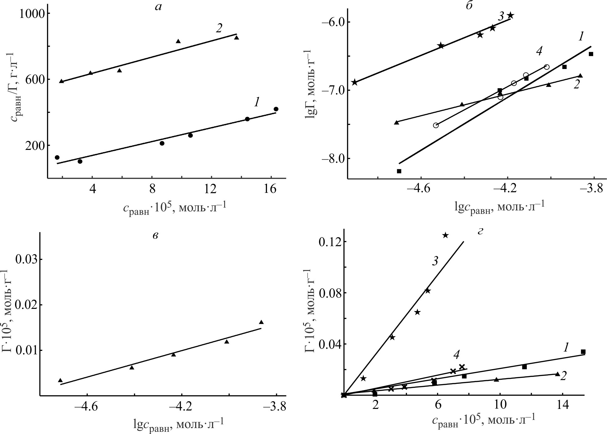 Рис. 2. Изотермы адсорбции на сульфидной медно-никелевой руде в координатах Ленгмюра (а): 1 — 4-(4-сульфофенилазо)нафтол-1 (рис. 1, изотерма 2), 2 — 2-(4-карбоксифенилазо)-п-крезол (изотерма 6); Фрейндлиха (б): 1 — 4-(4-карбоксифенилазо)фенол (изотерма 5), 2 — 2-(4-карбоксифенилазо)-п-крезол (изотерма 6), 3 — 4-(4-карбоксифенилазо)нафтол-1 (изотерма 1), 4 — 1-(4-сульфофенилазо)нафтол-2 (изотерма 3); Темкина (в): 2-(4-карбоксифенилазо)-п-крезол (изотерма 6); Генри (г): 1 — 4-(4-карбоксифенилазо)фенол (изотерма 5), 2 — 2-(4-карбоксифенилазо)-п-крезол (изотерма 6), 3 — 4-(4-карбоксифенилазо)нафтол-1 (изотерма 1), 4 — 2-(3-карбоксифенилазо)-п-крезол (изотерма 4).