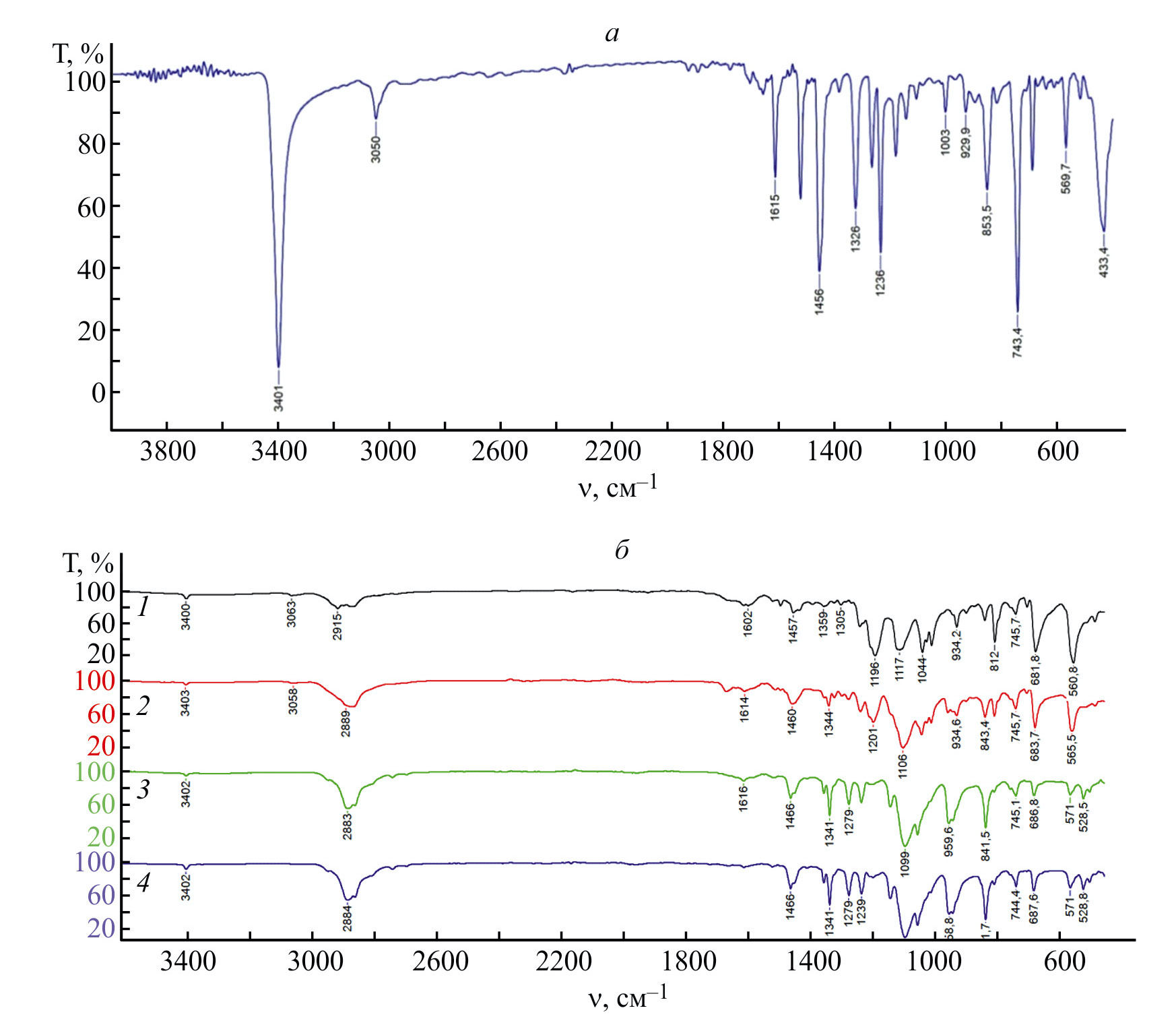 Рис.2. ИК-спектры индоло[3,2-b]карбазола (а) и индоло[3,2-b]карбазол-полиэтиленгликолей (б) с молекулярной массой 400 (1), 1000 (2), 2000 (3), 3000 (4).