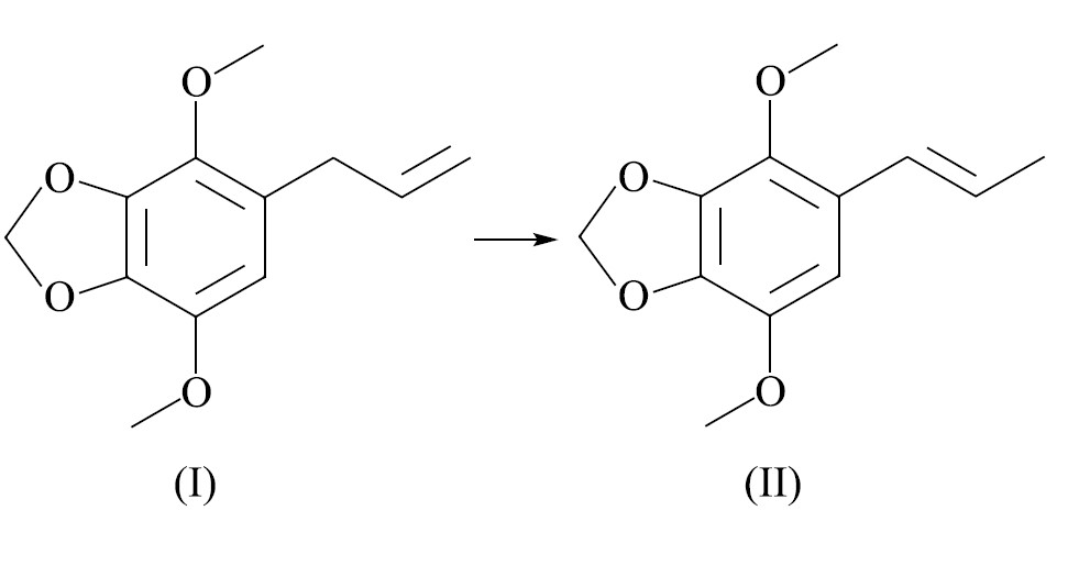 Благодаря наличию активной аллильной группы и ароматического кольца полиалкоксиаллилбензолы (в частности, апиол) могут использоваться в качестве исходных реагентов для органического синтеза [7, 8], в том числе для получения ряда биологически активных соединений, обладающих противоопухолевым и антиоксидантным действием [9, 10]. Промежуточным продуктом в синтезе этих соединений является (E)-4,7-диметокси-5-(проп-1-ен-1-ил)бензо[d]1,3-диоксол (изоапиол), получаемый изомеризацией апиола (III):