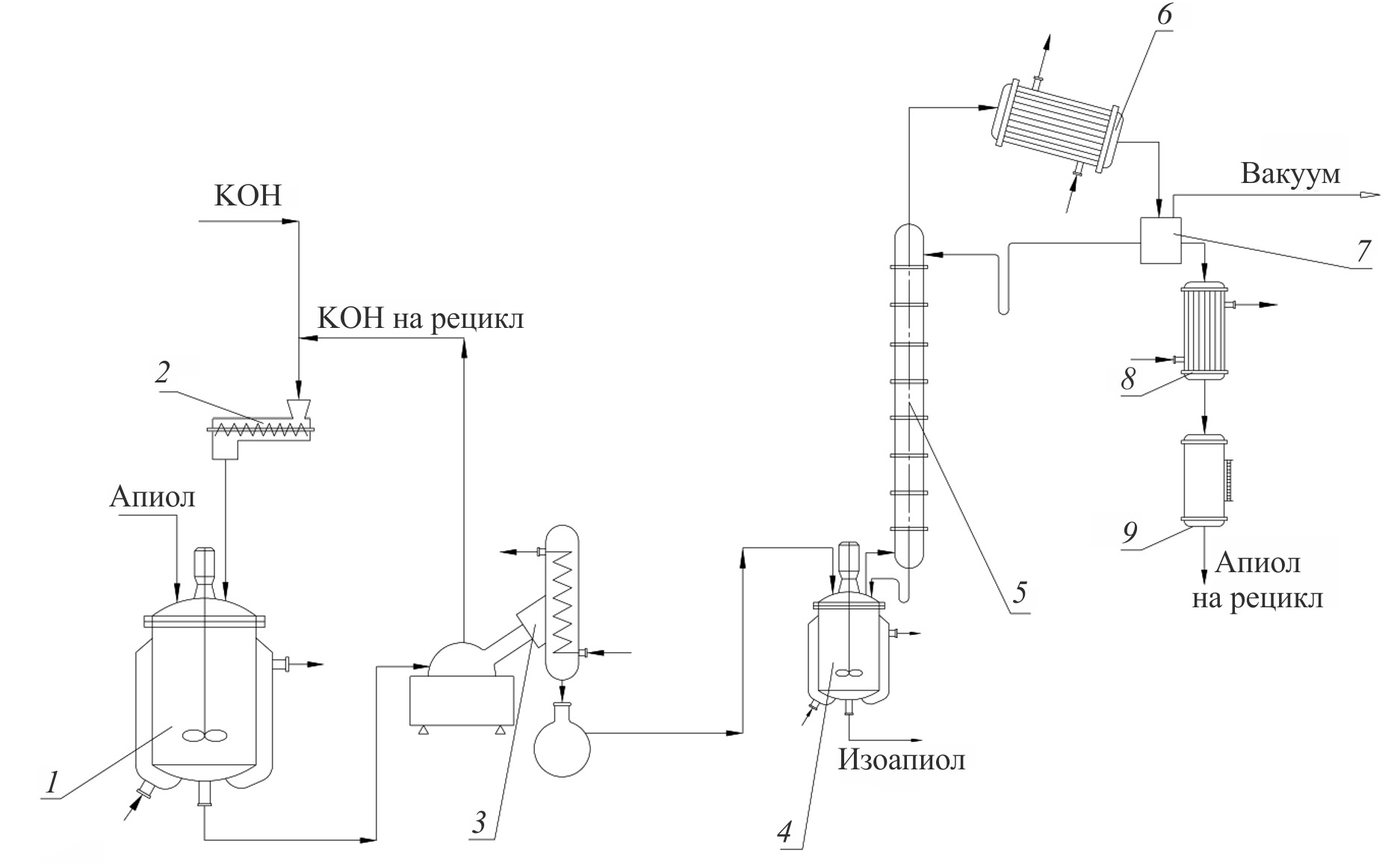 В реактор 1 (аппарат емкостной, стальной, снабженный мешалкой, загрузочным люком и рубашкой для подогрева) при перемешивании загружали апиол и через шнековый дозатор 2 KОН. Нагрев реакционной массы при температуре 80°С проводили в течение 3 ч. Затем реакционную массу направляли на роторный испаритель 3, где происходило отделение кубового остатка, содержащего KОН, который возвращали на стадию изомеризации, а отгон (соотношение апиол:изоапиол — 20:80 мас%) направляли в куб ректификационной колонны 4 (аппарат емкостной, стальной, снабженный мешалкой, загрузочным люком и рубашкой для подогрева). На колонне 5 (колонна ректификационная, насадочная, эффективностью не менее 12 теоретических тарелок) проводили ректификацию реакционной смеси. Полученную в голове колонны фракцию, обогащенную апиолом, направляли на стадию изомеризации. Кубовой остаток с содержанием изоапиола не менее 99 мас% направляли для последующего использования или хранения. В данной технологической схеме не указаны объемы и производительность технологического оборудования. Данные параметры определяют после оценки потребления изоапиола.