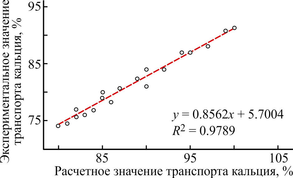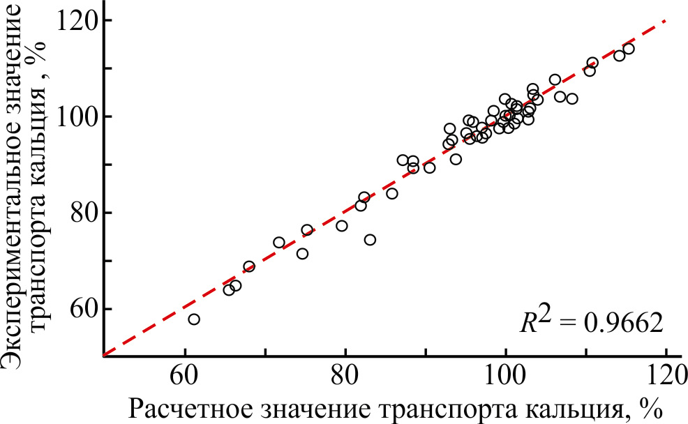 Рис. 5. Корреляция экспериментальных (полученных на модельной установке) и расчетных (полученных с использованием нейросети) показателей транспорта кальция.