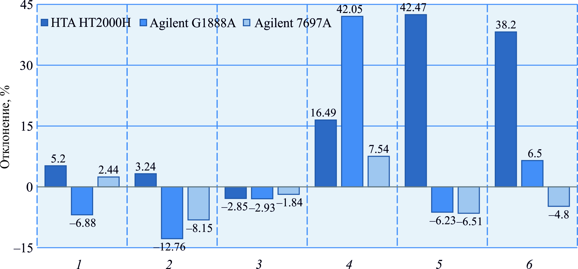 В рамках проведения сравнительных исследований пробоотборников также было рассчитано отклонение результатов между двумя экспериментами (оценка извлечения из двух растворов остаточного органического растворителя, приготовленных в одинаковой концентрации). Практически все полученные значения попали в ожидаемую область ±15% (см. рисунок). Выпадение значений фиксировалось в тех же случаях, когда наблюдался большой разброс площадей пиков и нарушалась линейная зависимость, а именно в случае водного раствора уксусной кислоты при использовании пробоотборников НТА НТ2000Н и Agilent G1888 и растворов N,N-диметилформамида в ДМСО и воде при использовании пробоотборника НТА НТ2000Н.