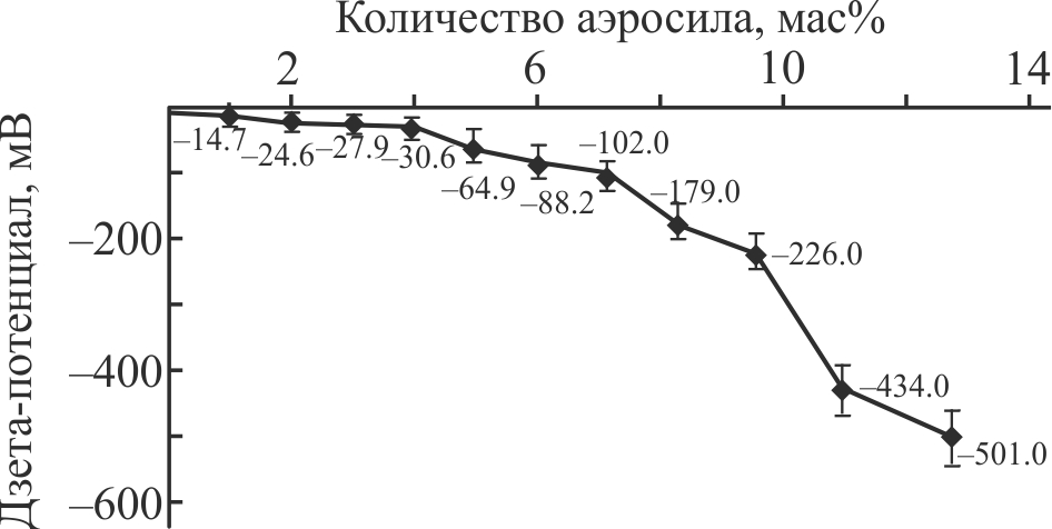 Рис. 2. Усредненная кривая зависимости ζ-потенциала дисперсной системы от концентрации загустителя (аэросила) при формировании in situ лекарственной формы «Агсулар® гель 1.5%» (T = 20°С).