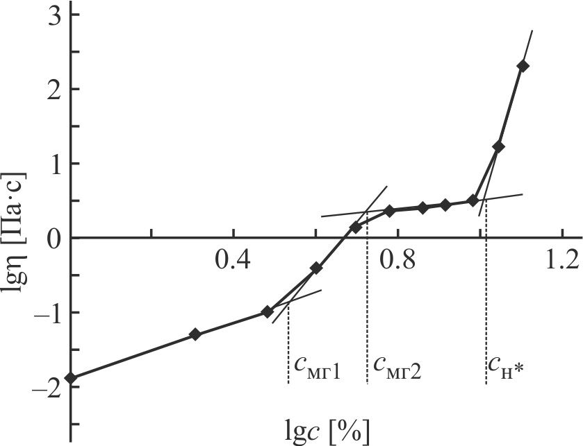 Так, при концентрации до 3.5% аэросила в дисперсной системе (cмг1 на рис. 3) происходит агрегация частиц дисперсной фазы, дальнейшее увеличение содержания аэросила (до 5.5%) приводит к образованию областей микрогеля в дисперсной системе (cмг2 на рис. 3). Далее (с момента второго излома cмг2) концентрация областей микрогелей достигает критического значения, после чего начинается процесс формирования макрогеля (cн* = 10% аэросила на рис. 3). Полученные данные также хорошо коррелируют с данными зависимости динамической вязкости от концентрации загустителя (аэросила) в традиционных координатах (рис. 1).