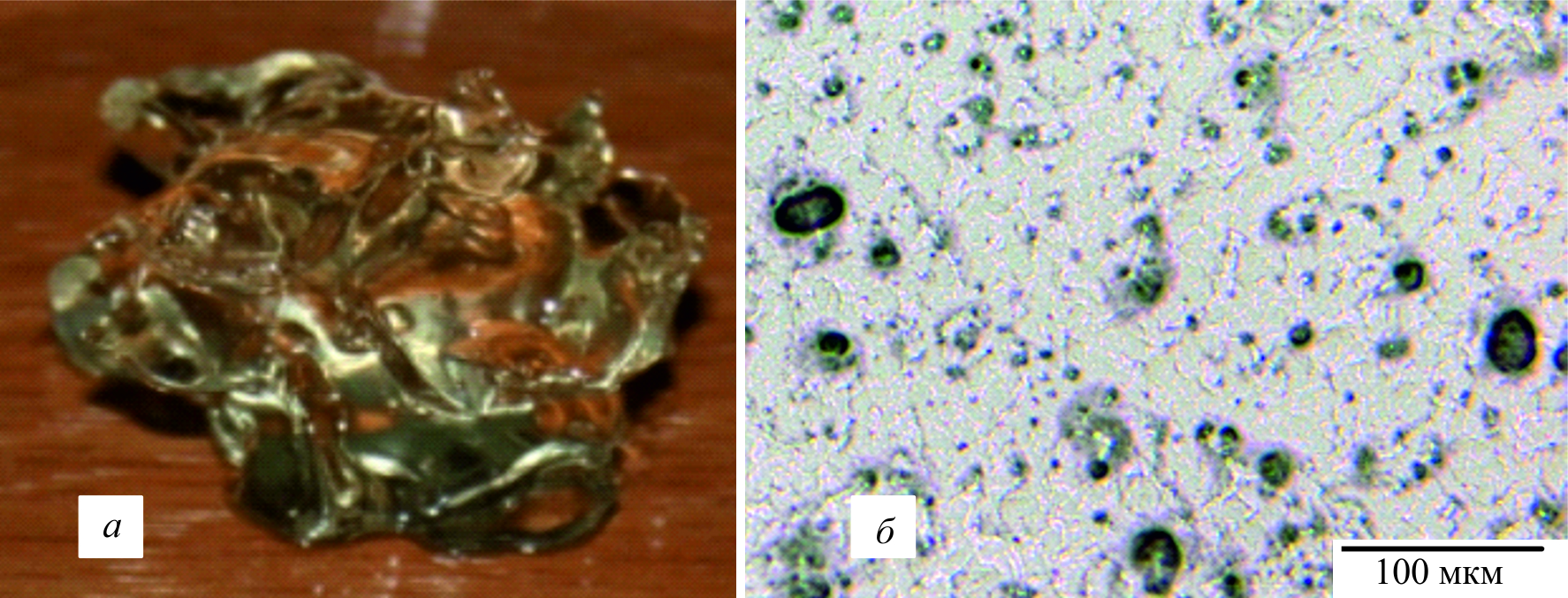 В результате был получен однородный по внешнему виду и содержанию действующего вещества гель (рис. 4, а), размер частиц в котором не превышает 100 мкм (рис. 4, б), что полностью соответствует нормативным требованиям.6