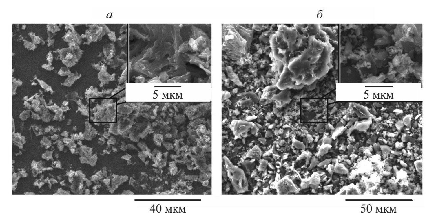 Из СЭМ-изображений видно, что частицы порошка имеют хлопьевидную развитую пористую структуру со средним размером частиц 20 мкм (рис. 1, а). Увеличение температуры карбонизации порошкового материала приводит к уменьшению размера частиц (рис. 1, б), т. е. крупные агломераты разрушаются.