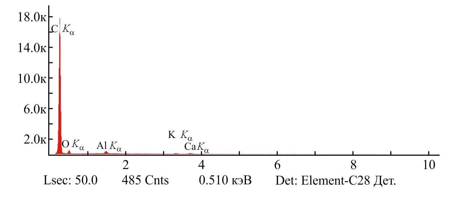 Элементный анализ порошковых материалов показал, что на поверхности активированного угля имеются небольшие включения, состоящие из соединений Al, Ca и K, их процентное содержание составляет всего 0.30–4.80% от общего количества, поэтому влияние данных элементов на электрохимические характеристики СК установить не удалось.