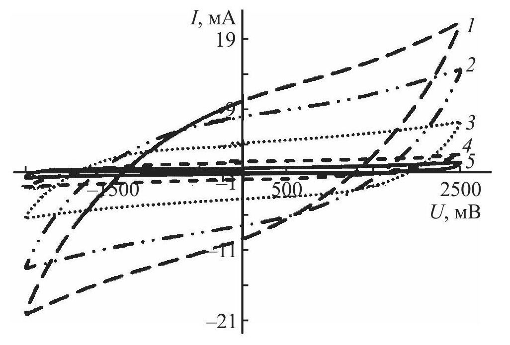 Рис. 3. Циклические вольт-амперные характеристики (ВАХ) электродов из скорлупы грецкого ореха, карбонизированных при 900°С в течение 30 мин с активацией при 500°С в течение 15 мин. Скорость развертки потенциала (мВ·с–1): 1 — 400, 2 — 240, 3 — 80, 4 — 20, 5 — 5.